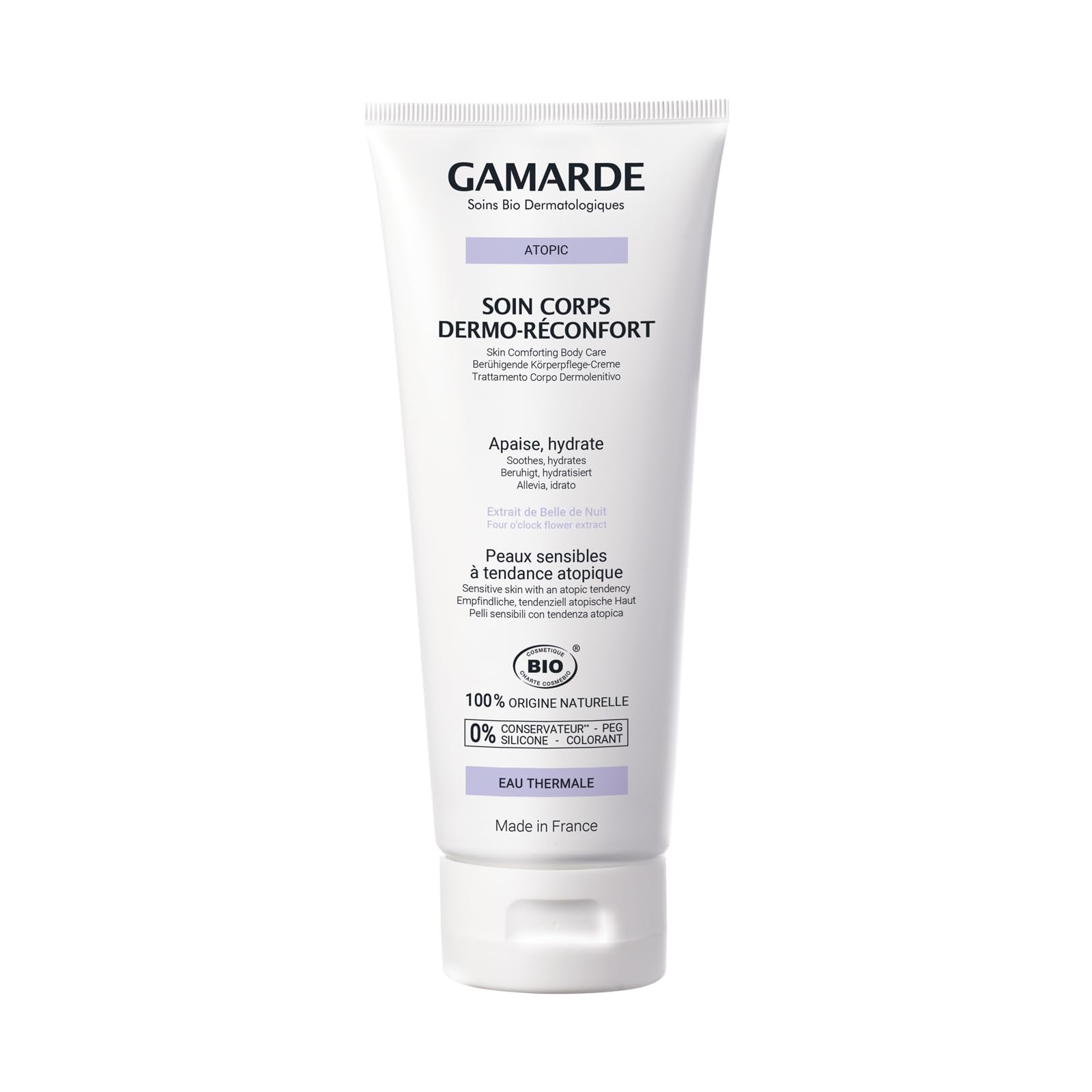 Gamarde Dermo-Réconfort Soin Corps is a certified organic body care treatment specially developed to soothe, hydrate, and comfort sensitive, atopic-prone skin. With 100% natural-origin ingredients, it provides long-lasting relief from dryness, irritation, and tightness—without the use of preservatives, silicones, or synthetic colorants.